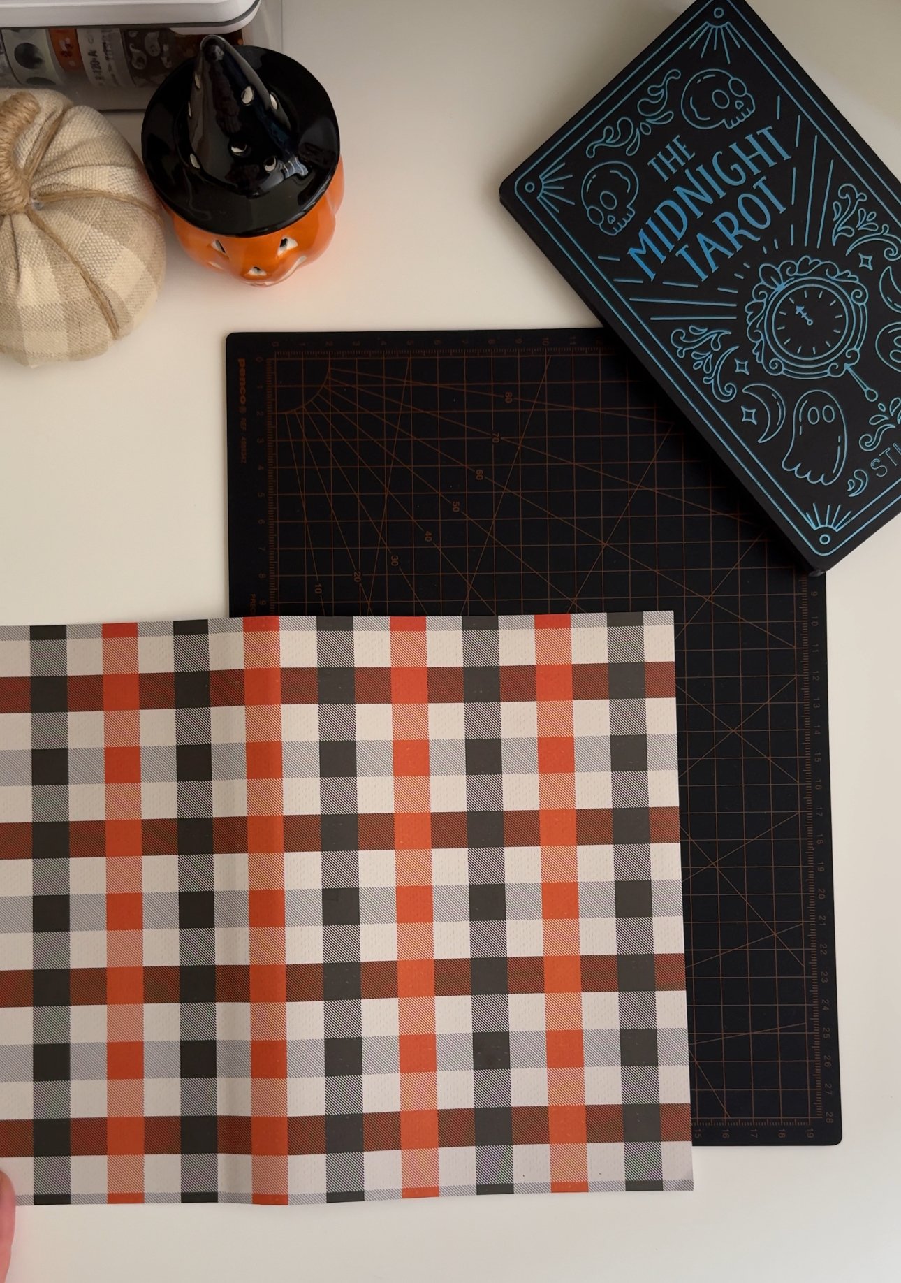 When it comes to fall and Halloween, I love to choose those traditional holiday colors, you know, black, orange and I like to mix it with a neutral so this checkered pattern I found in the paper pad was perfect! I also thought it would serve as a nice background with fall and Halloween themed designs and pictures.